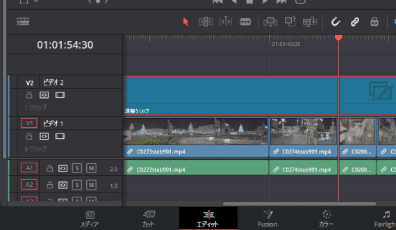 キーボードの「→」を押すだけで、「調整クリップ」が選択された状態、かつ、別ビデオトラックのクリップの先頭に再生ヘッダを移動できる場合があります。