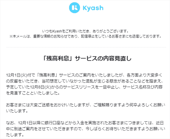 「残高利息」とは、銀行口座などからプリペイド型カード「Kyash」へ入金した残高に対し、年利換算で1%分のKyashバリューを毎月付与するサービス。12月1日付けで発表され、8日よりサービス開始予定としていましたが、直前の7日になって急遽リリース中止の流れとなりました。