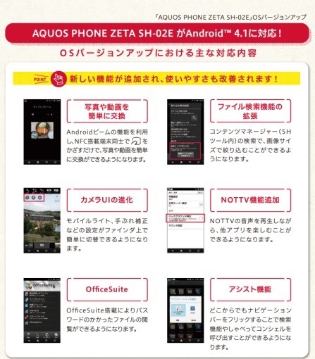 AQUOS PHONE ZETA(SH-02E)がAndroid 4.1へアップデート開始