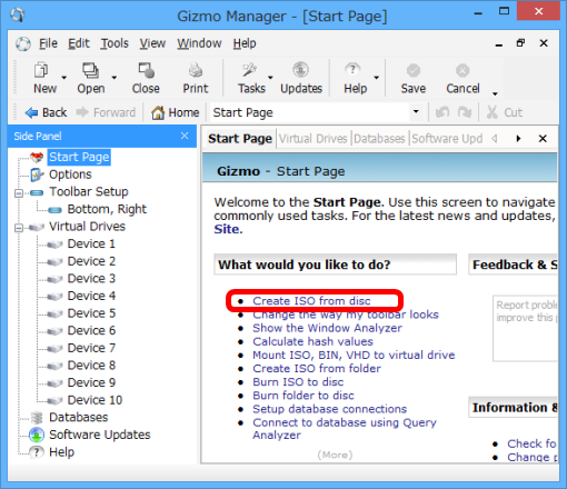 機能が豊富な「GizmoDrive」ですが、例えば、光学メディアから ISO 正式に変換する場合は、以下画面の「Create ISO from disc」を開きます。
