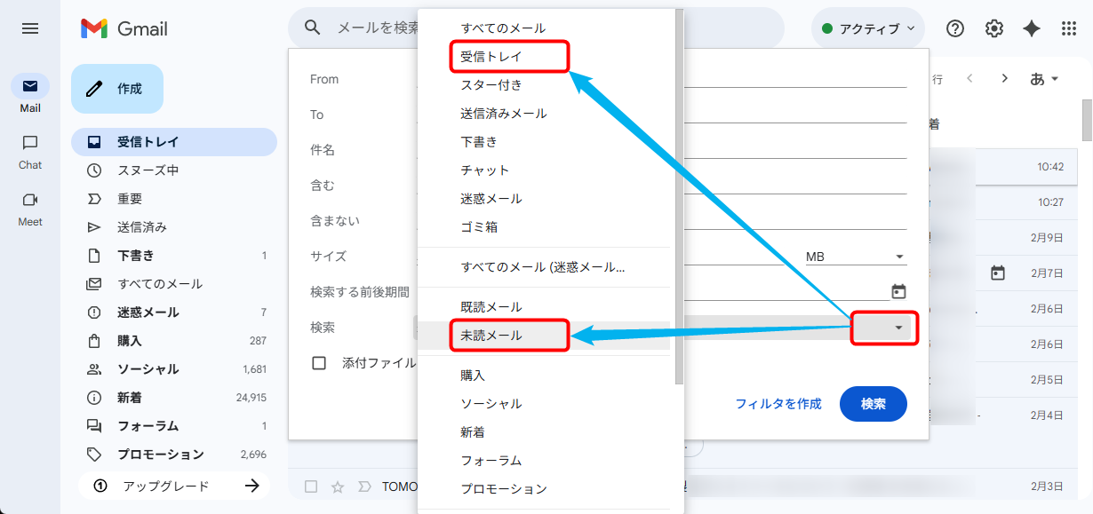 さらに「検索」のプルダウンを開くと、検索対象として「未読メール」や「受信トレイ」を選ぶこともできます。