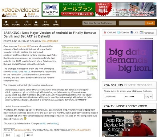 xda-developers によると、現地時間の18日深夜にマスターブランチにコミットされた Android のソース(AOSP)で、デフォルトのランタイムがARTに変更されていたとの事です。