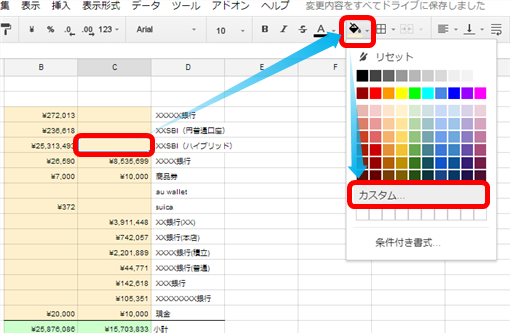 手順はカンタンで、背景色を吸い上げたいセルにカーソルを合わせ、「塗りつぶし色」→「カスタム」を押すと、