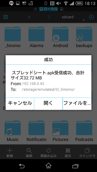 転送時、受信側端末では、ESファイルエクスプローラーを立ちあげたままにしておくのがよいです。