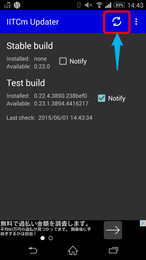 アップデートを検知すると、通知領域に「IITCm XXXX update available」と表示されるので、タップします。