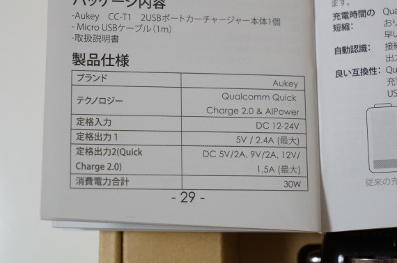 出力は計30W。Quick Charge 2.0 対応ポートが 5V/2A、9V/2A、12V/1.5A。非対応ポートは 5V / 2.4A。