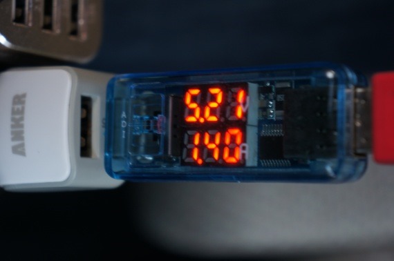 参考までに、Anker のカーチャージャーと急速充電ケーブルの組み合わせでは実測 5.21V / 1.40A、つまり7Wでした。