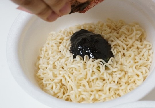 説明にはありませんでしたが、とにかくソースの粘度が高かったのと、別のカップ麺ではソースをフタの上で温めろと説明があったので、温めておくことに。