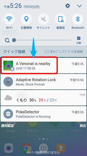 通知領域をタップすると、マップ上にポケモンが表示されます。ポケモンをタップするとそのポケモンが消えるまでの時間も分かります。