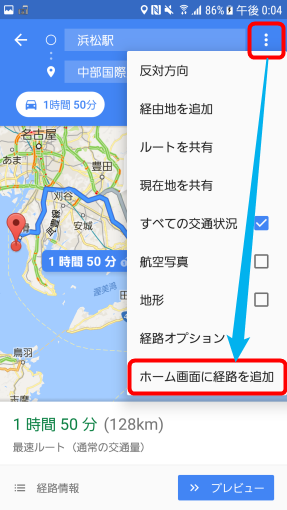 方法は簡単で、Google マップで普段通り経路を検索したら、右上のメニュー→「ホーム画面に経路を追加」をタップします。