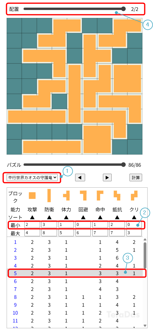 テトロパズルの解き方は1つではありません。攻撃力・防御力・命中など、自分が伸ばしたいステータスを優先してパズルを装着するのも重要ですので、ぜひこちらのツールも活用してみてください。