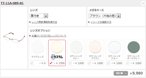 色付きレンズのイメージが沸かないのがちょっと不便でしたが、とりあえず、色無しの状態で気に入るモノを選んで型番を控えて…。という感じ。
