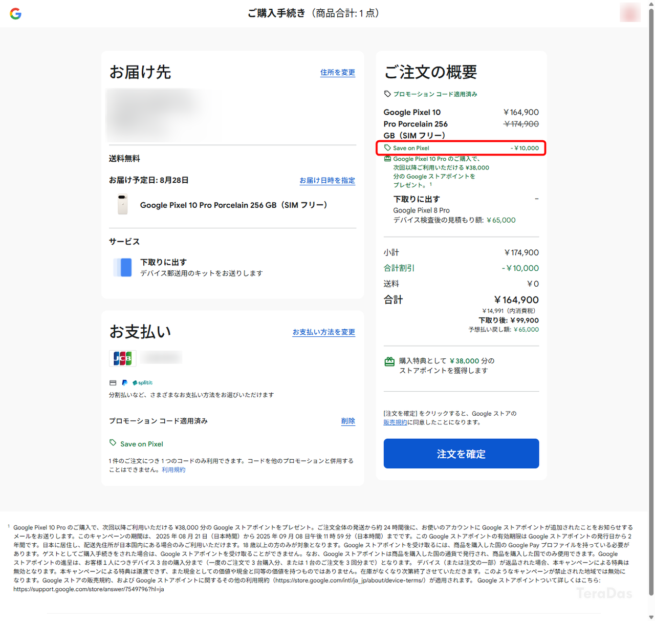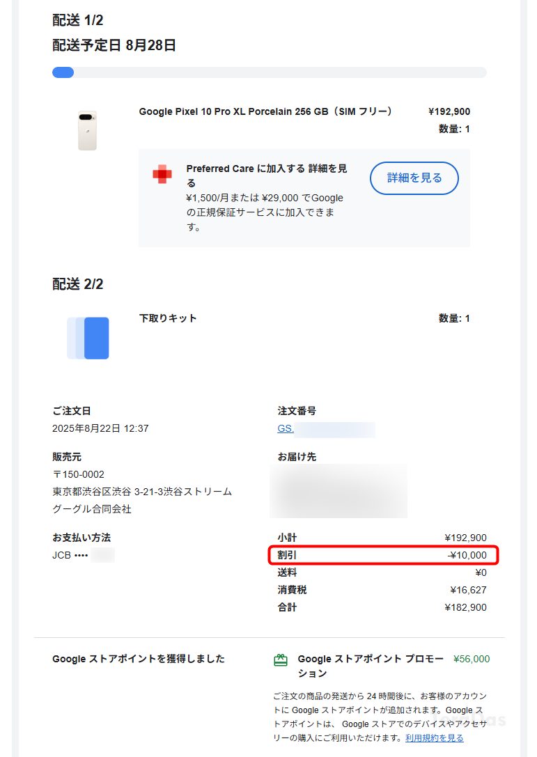 私も実際にプロモーションコードを使って「Google Pixel 10 Pro」を購入 → キャンセルして、