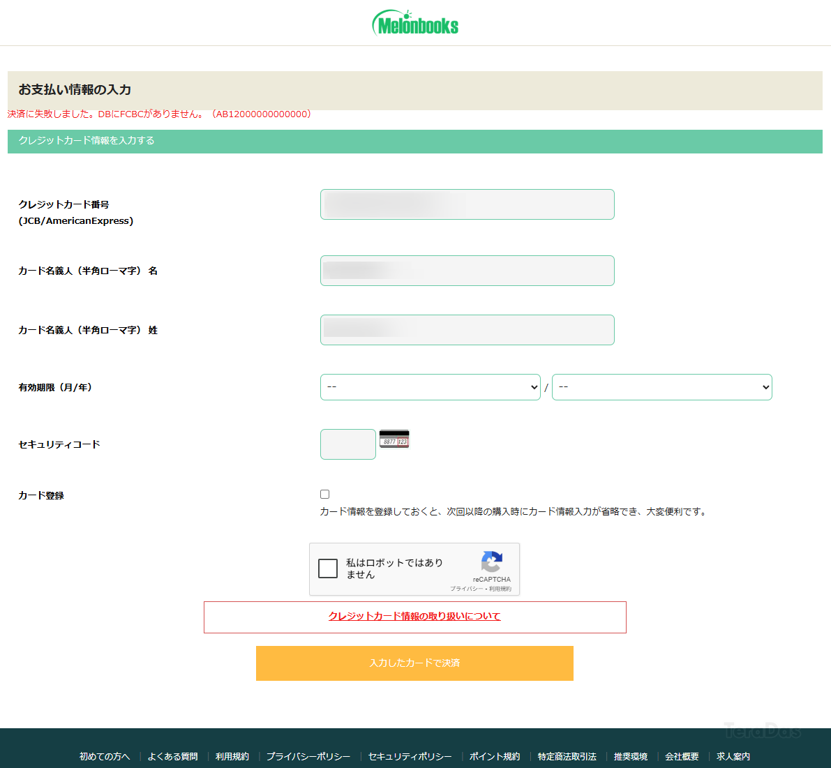 カード決済時に「決済に失敗しました。dbにfcbcがありません」エラーが出た場合の原因と対処方法【ネット通販】