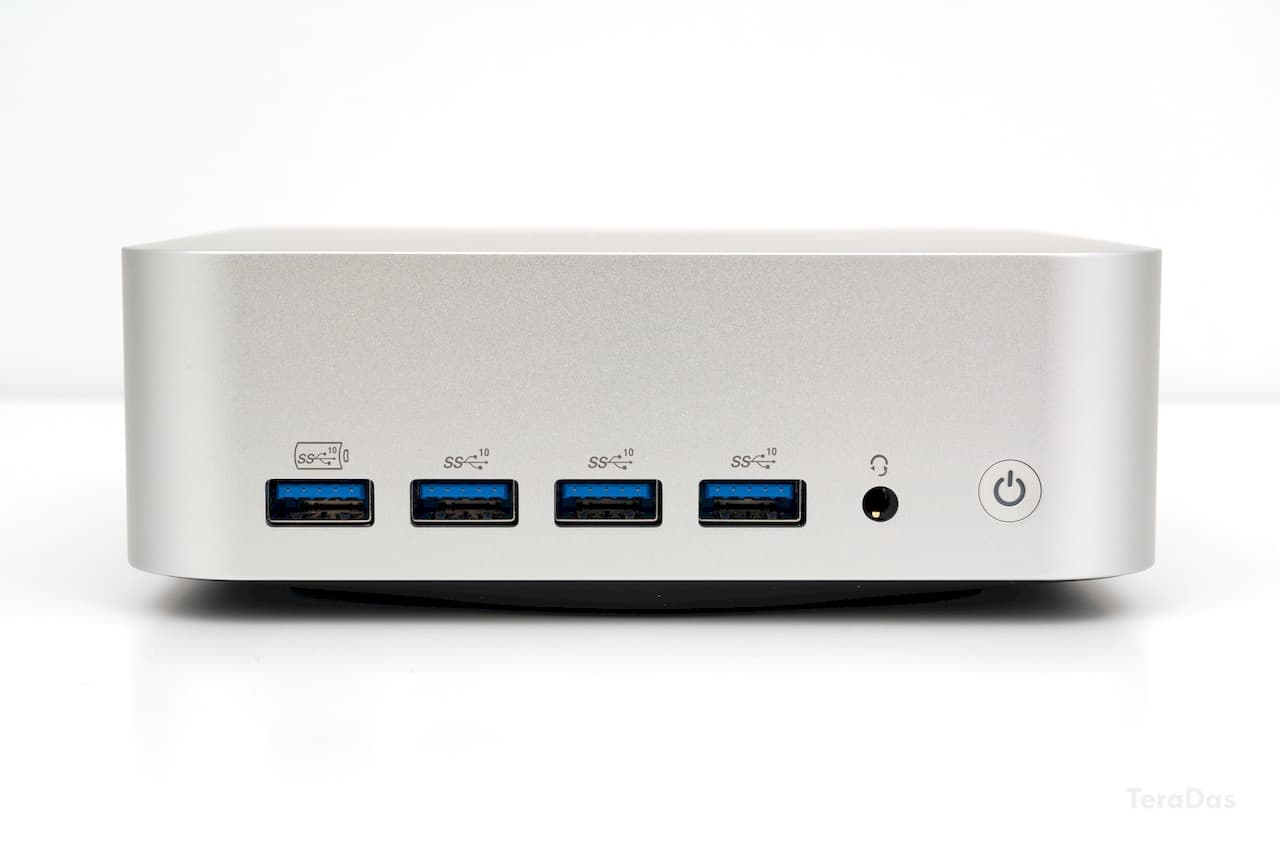 本体前面には、USB 3.2 Gen2 Type-A x 4 ポート、3.5mm ヘッドセットジャック、電源ボタンを配置。フロントUSBが4ポートもあるのは大変便利。さらに1番左のポートは電源OFF時でも給電可能。