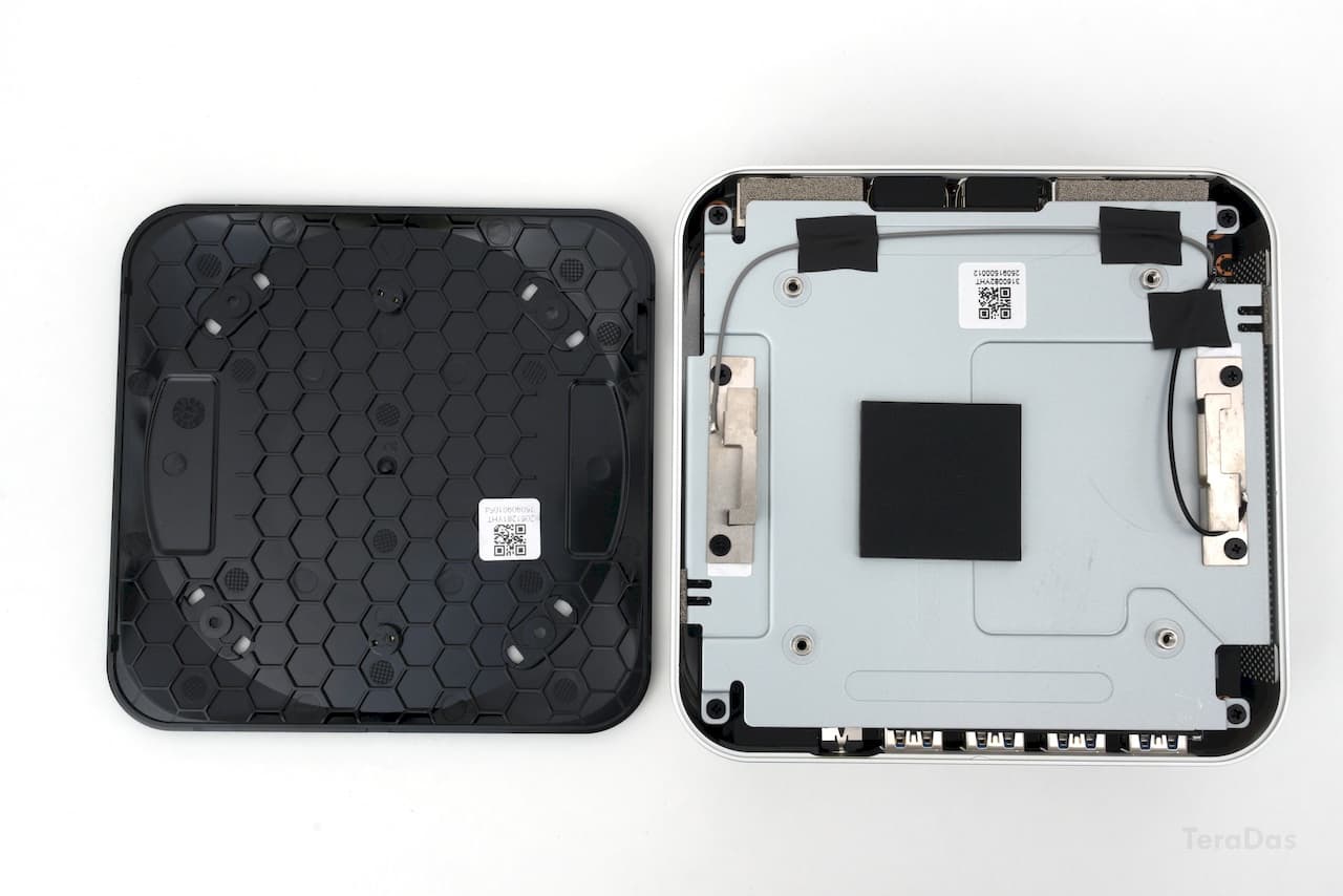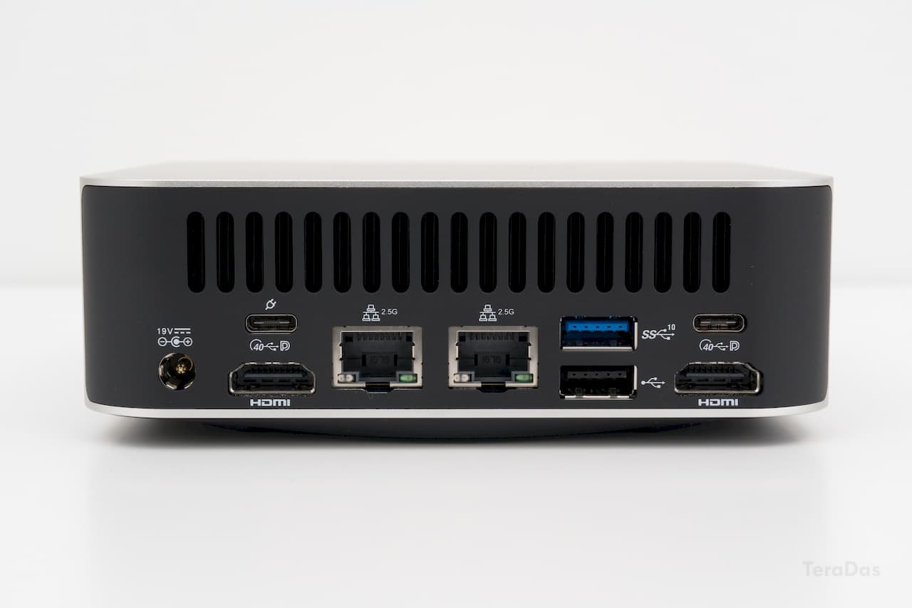 背面は樹脂製。2.5 GbE x 2ポートを中心に、USB 4 x 2ポート、USB 2.0 Type-A x 1ポート、USB 3.2 Gen2 Type-A x 1ポート、HDMI 2.0 x 2ポートを配置。ミニPCとしては高い拡張性です。