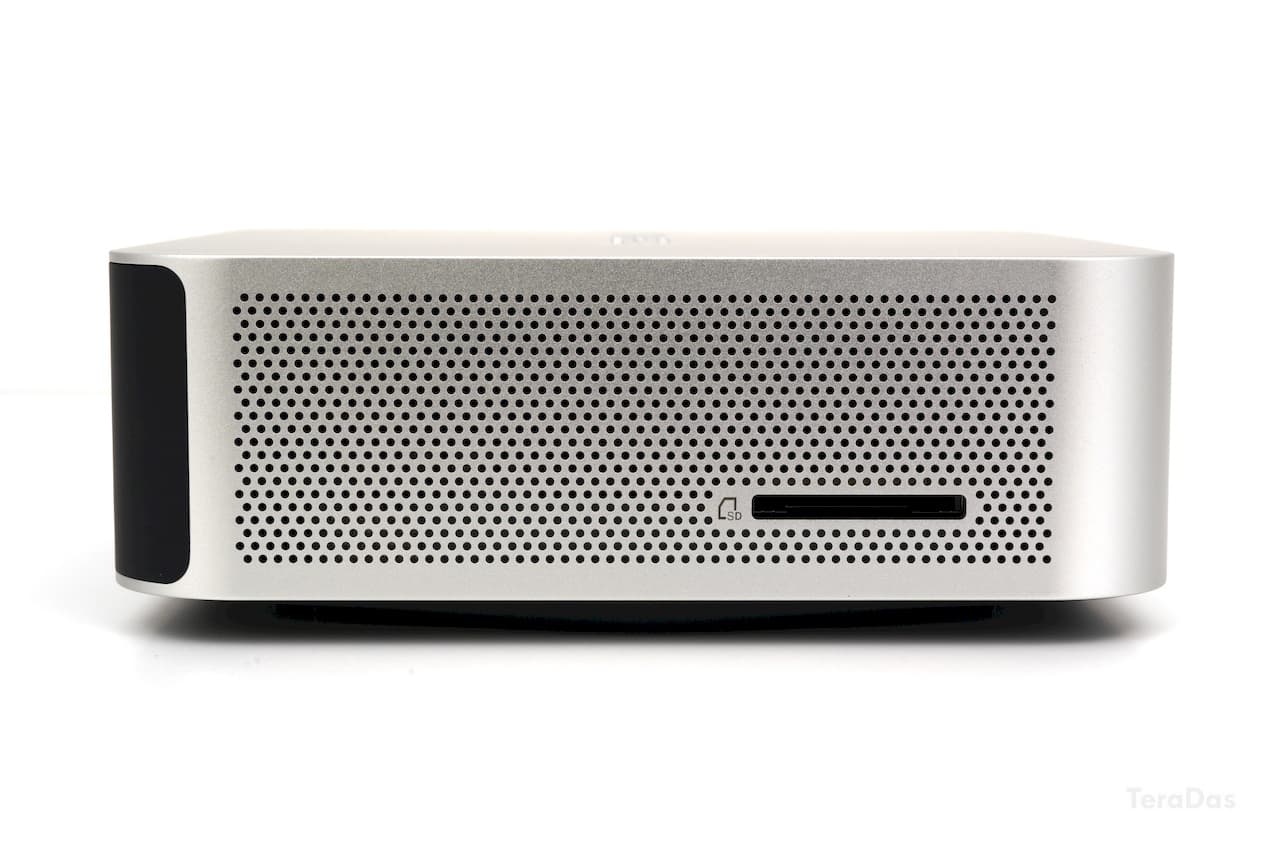 左側面には SDXC カードリーダライター。ベンチマーク結果はシーケンシャルリード277MB/s、ライト202MB/s(ProGrade COBALT 128GB UHS-II V90 使用時)。専用リーダライターと比べてもかなり高速で動画の取込みなどに役立ちそう。