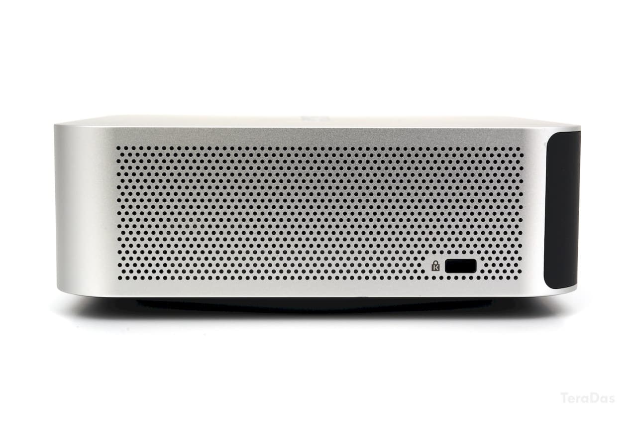 右側面には企業ユースに安心なケンジントンロックを配置。筐体は GEEKOM のシグネチャーともいえる梨地の金属製シャーシで高級感あり。エアフローは側面吸気、背面排気。