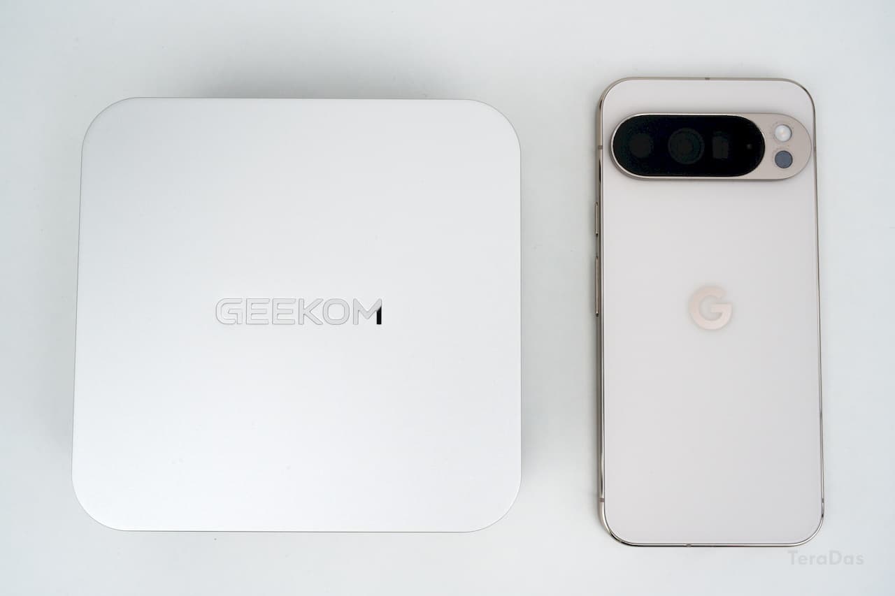 Google Pixel 10 Pro XL とのサイズ比較。本体サイズは 135 x 132 x 47mm(含むゴム足、実測参考値)。最近のミニPCとしては標準的~若干大きめ。