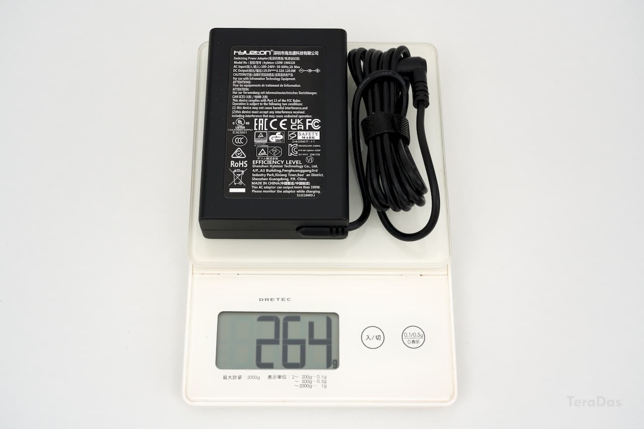 ACアダプタは Hyleton 製の hyleton-120W-1906320。出力は 19V⎓6.32A 120W。PC への給電ケーブル込みで 264g とかなり小型軽量。