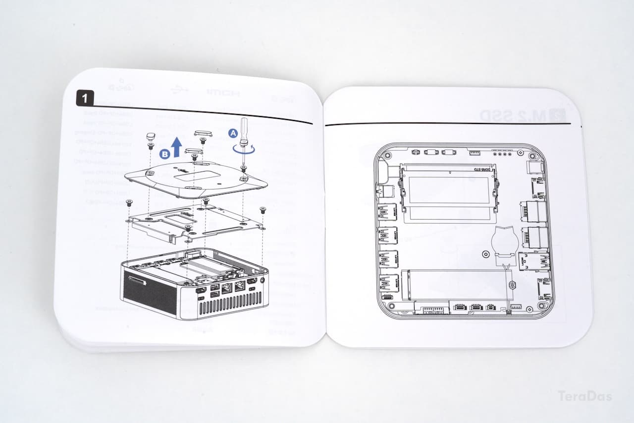 説明書には内部基板へのアクセス方法の説明も。メモリ増設、SSD 交換が可能。