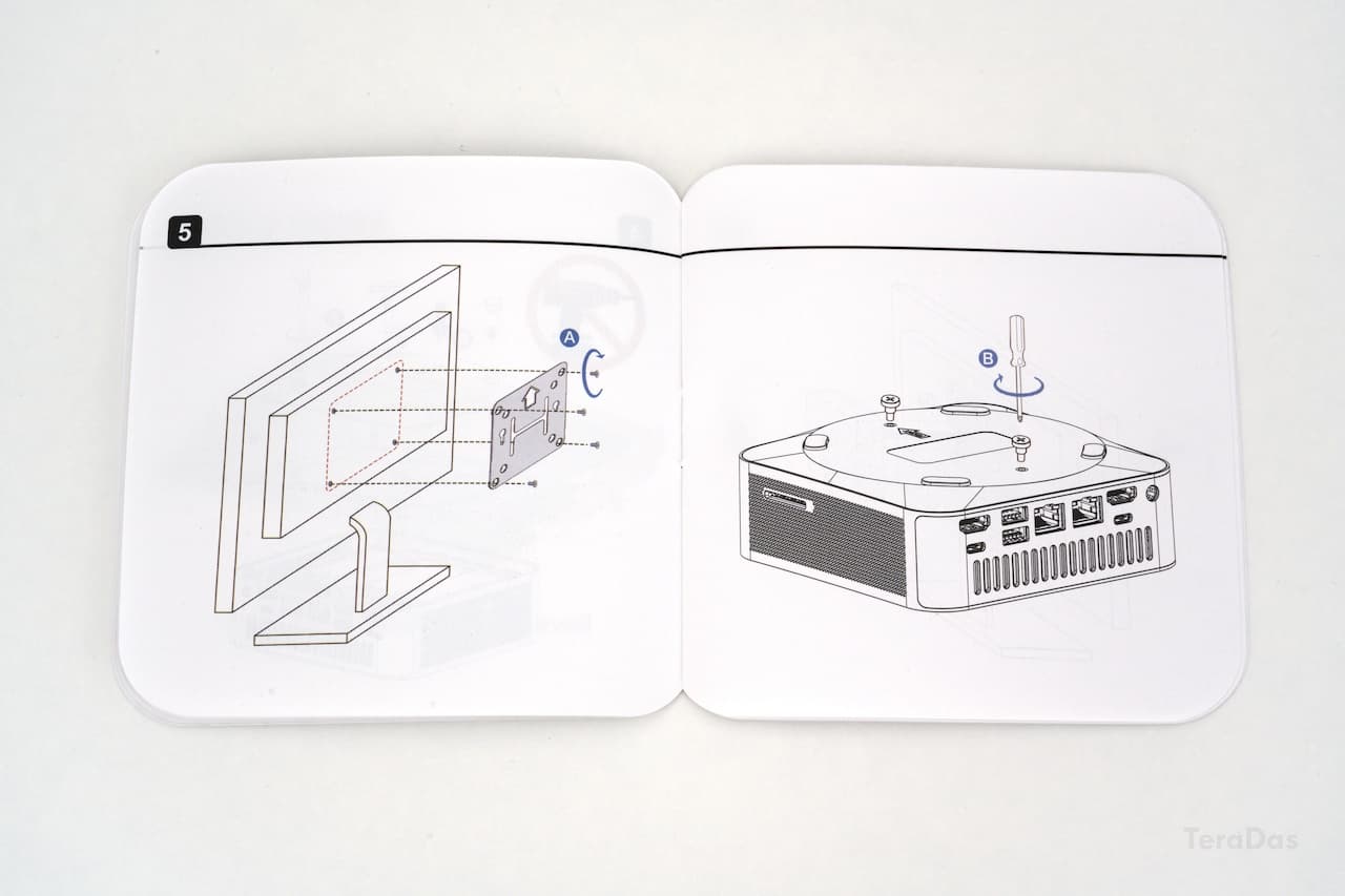 VESA マウントにも対応。ディスプレイ側に付属の金具を取り付け、ミニ PC 本体に付属のネジを取り付け → 金具に本体のネジを引っ掛けてマウントする方式。