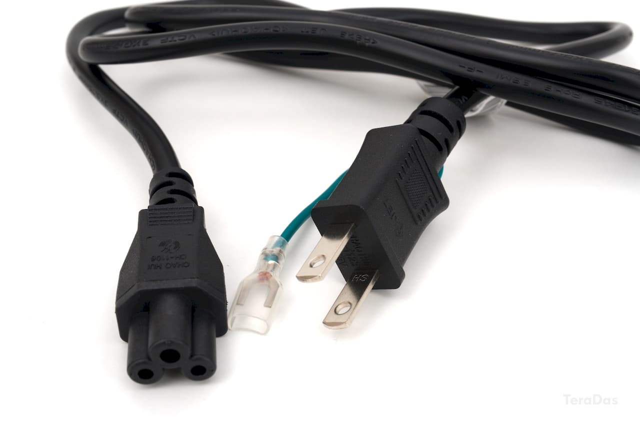 付属の電源ケーブルはプラグが旧来の「3極」→「2極+アース」へと改善。変換不要になり家庭でも使いやすくなりました。ACアダプタ側は3極ミッキー型。