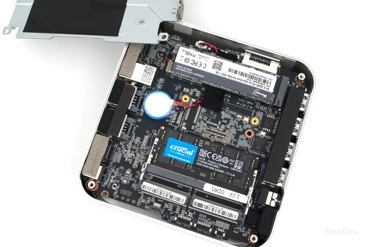 さらに金属シールドを外すと基盤が現れます。搭載メモリは今や高嶺の花の「Micron Crucial CT16G56C46S5.M8D1」(16GB DDR5-5600 CL46 S.O.DIMM)。メモリは 8GB x 2枚でなく16GB x 1枚挿し構成。