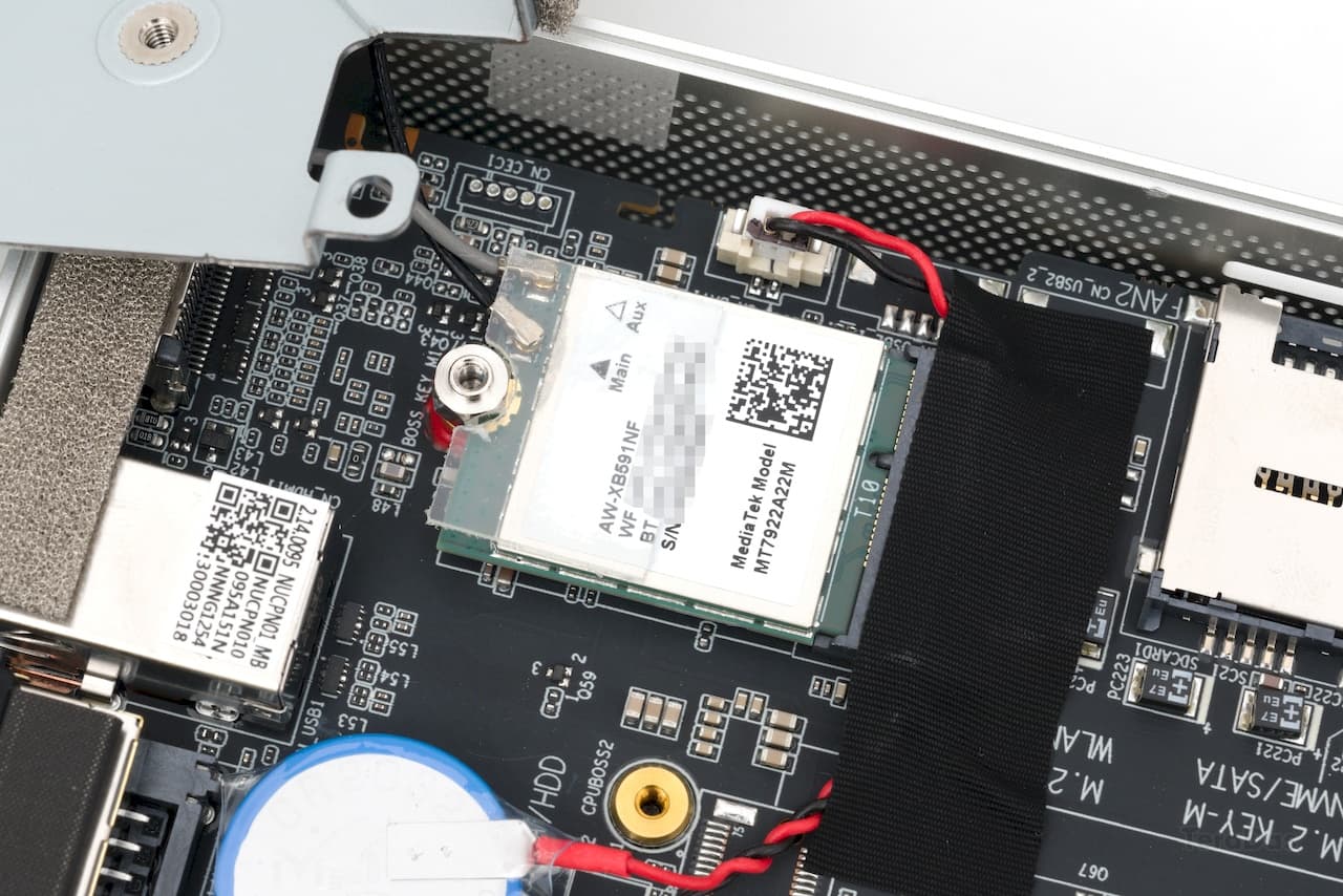 無線LAN / Bluetooth モジュールは MediaTek MT7922 採用の「Azurewave AW-XB591NF」。SSD 下の M.2 スロットに配置。本体底面の金属製シールドの取外し時は AW-XB591NF に接続されているアンテナ線が外れやすいので注意。万が一外れても AW-XB591NF 上の透明ガードが外しやすいよう改善されているので、嵌め直しやすくなっています。