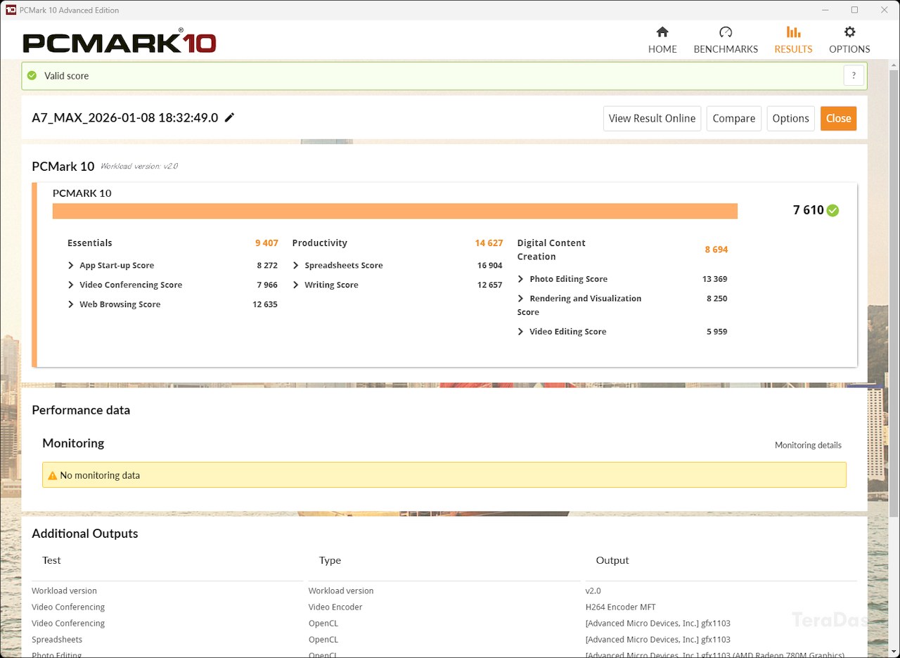 さすがにメモリ帯域が要求される内蔵GPU系ベンチマークスコアは伸び悩むものの、事務・生産性用途に効く「PCMARK 10」の Essentials が 9,407 あったり、また Productivity に至っては 14,627 を記録するなど、一般用途であればメモリ増設なしでも十分な性能を発揮します。