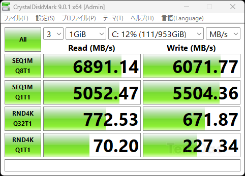CrystalDiskMark 9.0.1 のスコアは以下。
