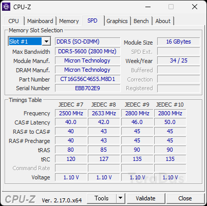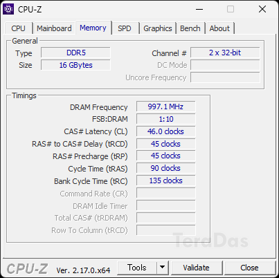 CPU-Z のメモリ情報は以下のおとり。「Channel #」は「2 x 32bit」表記(メモリ2枚挿しの場合は「4 x 32bit」表記となる)。DDR5 メモリは2枚挿し→1枚挿しで帯域が半分に減るため、とりわけ内蔵GPUのパフォーマンスが影響を受けます。忖度抜きで、メモリ価格高騰の今だからこそ敢えてこの構成を選んだのではないか、との印象を受けました。