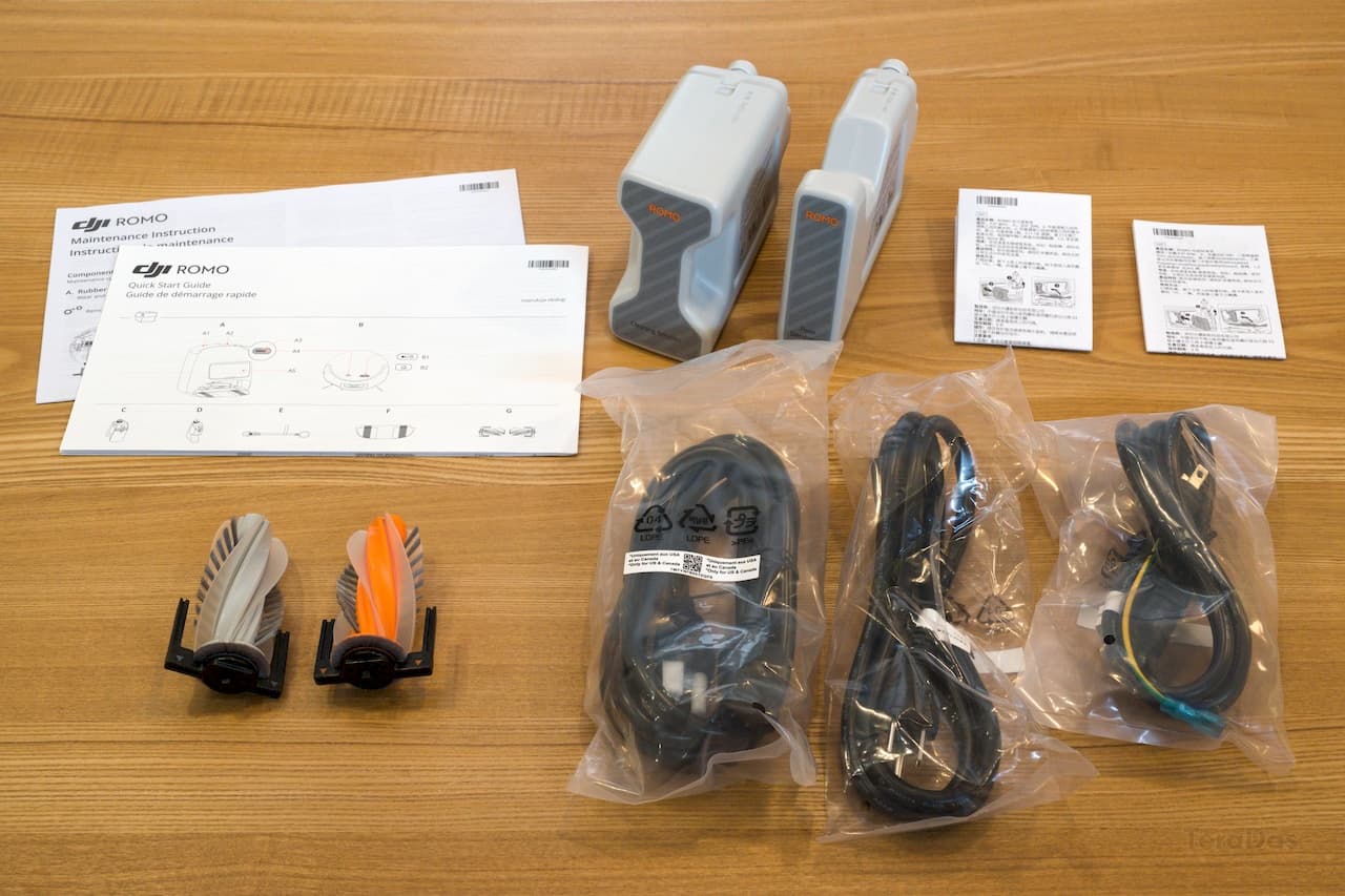 「ROMO P」の付属品はシンプル。専用洗剤、消臭剤、電源ケーブル3種、ROMO ブラシ&ゴム一体型ローラーブラシ、説明書類。