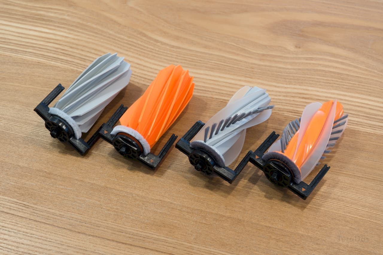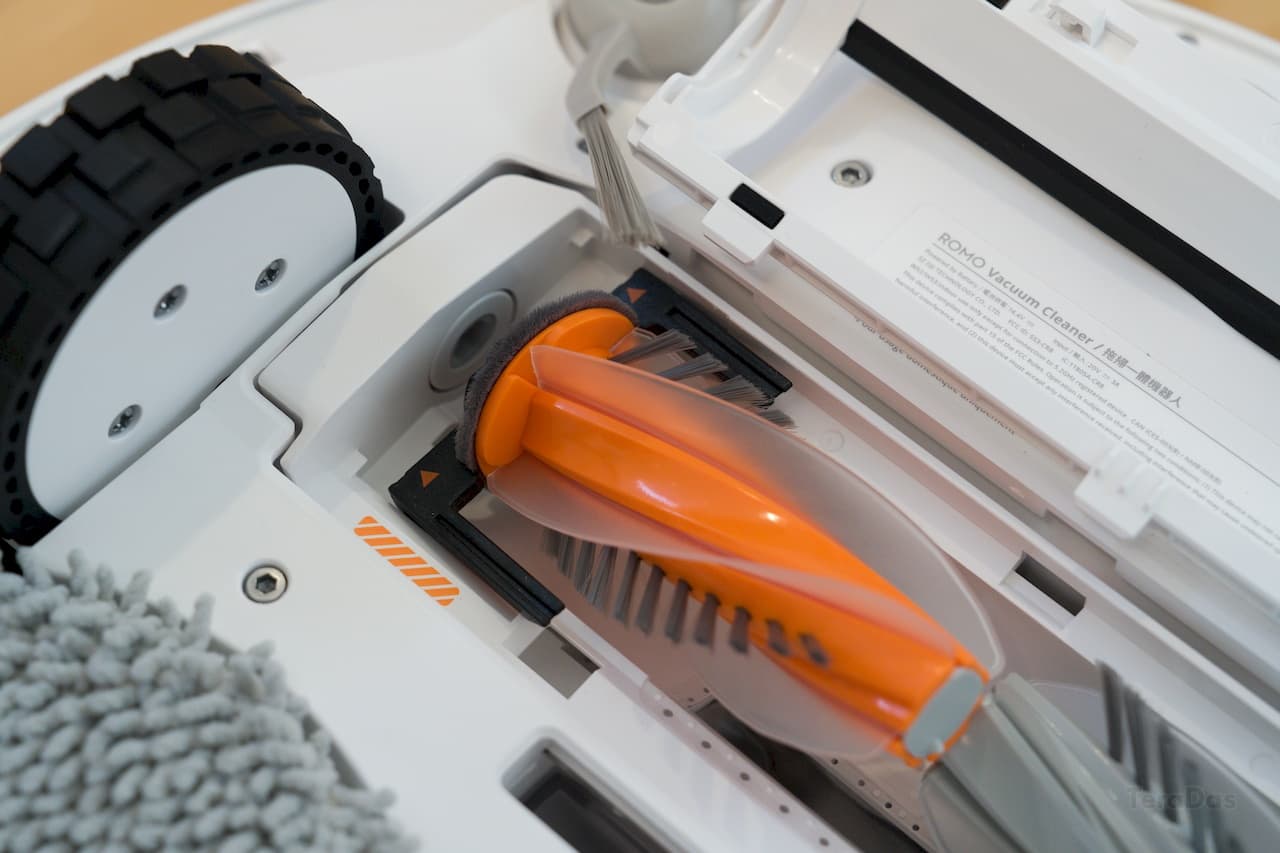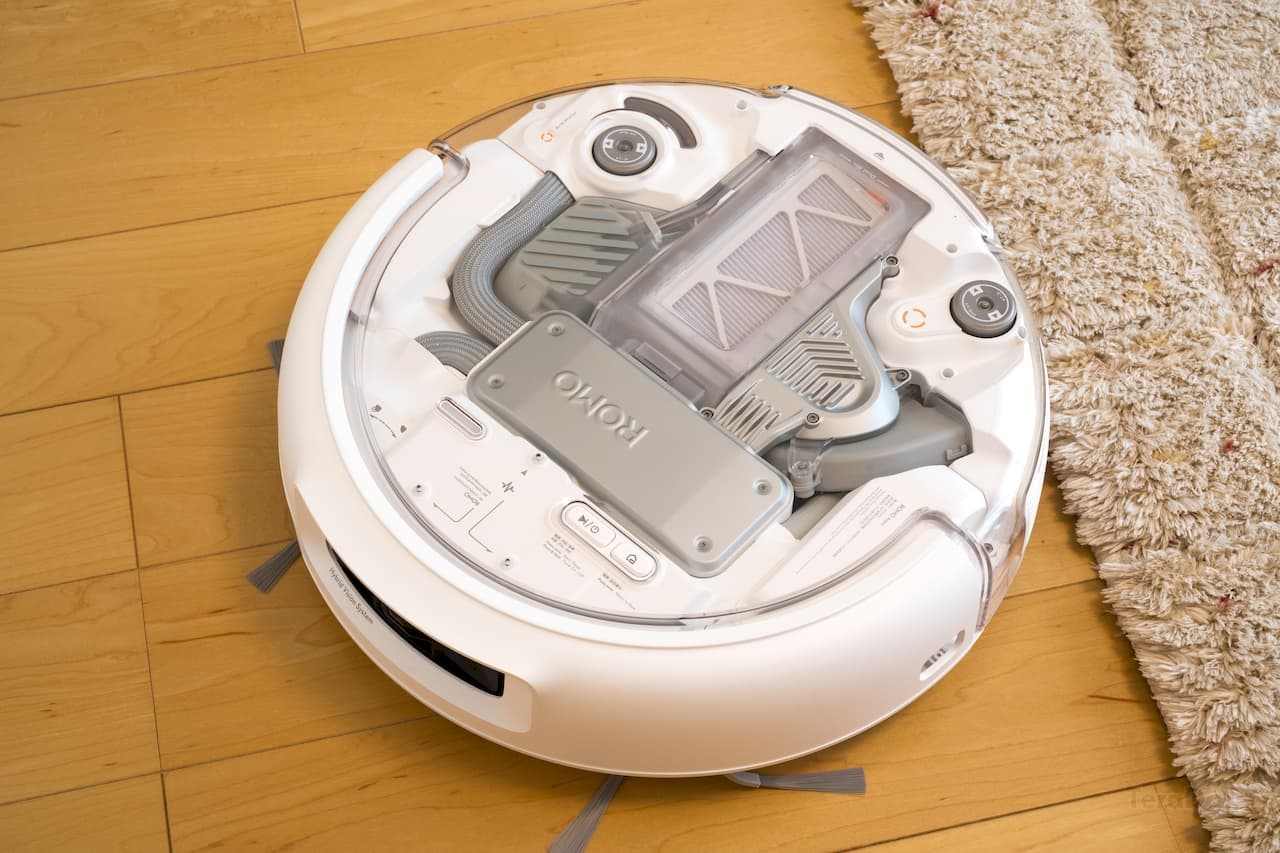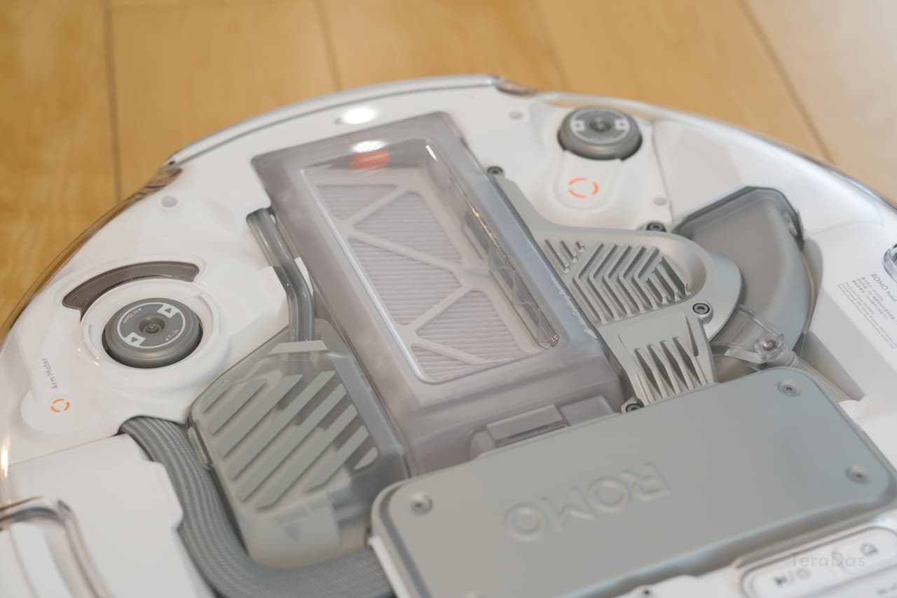 理想実現のためか、専用設計とみられる部材が多用されているのも特徴で、他ロボット掃除機では「どこかで見覚えのあるパーツや機構」、ときに他社製品と全く同じパーツを目にすることすらある中、驚くことに「ROMO」ではローラーブラシから回転モップ、伸縮する回転ブラシ、フィルター、静音マフラー、カメラ周りに至るまで見たことのないパーツばかり。