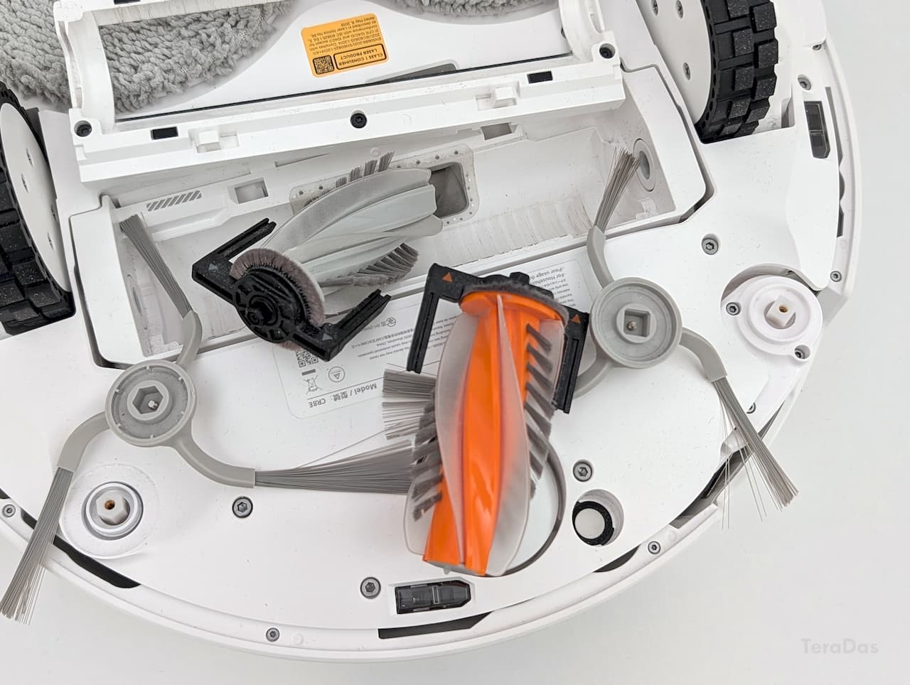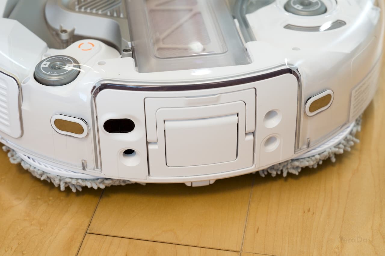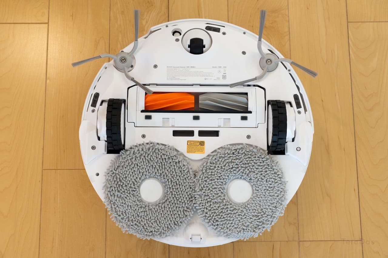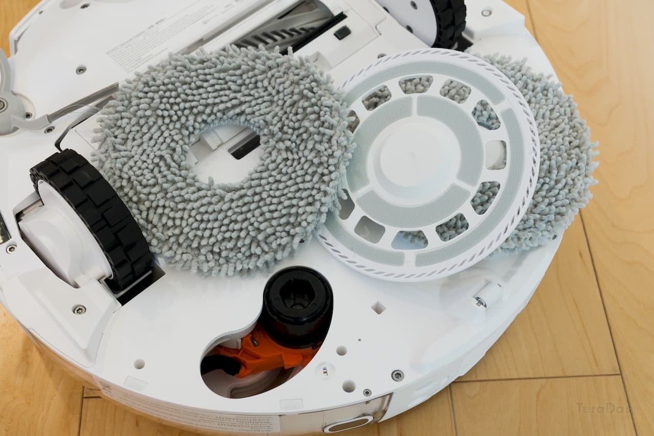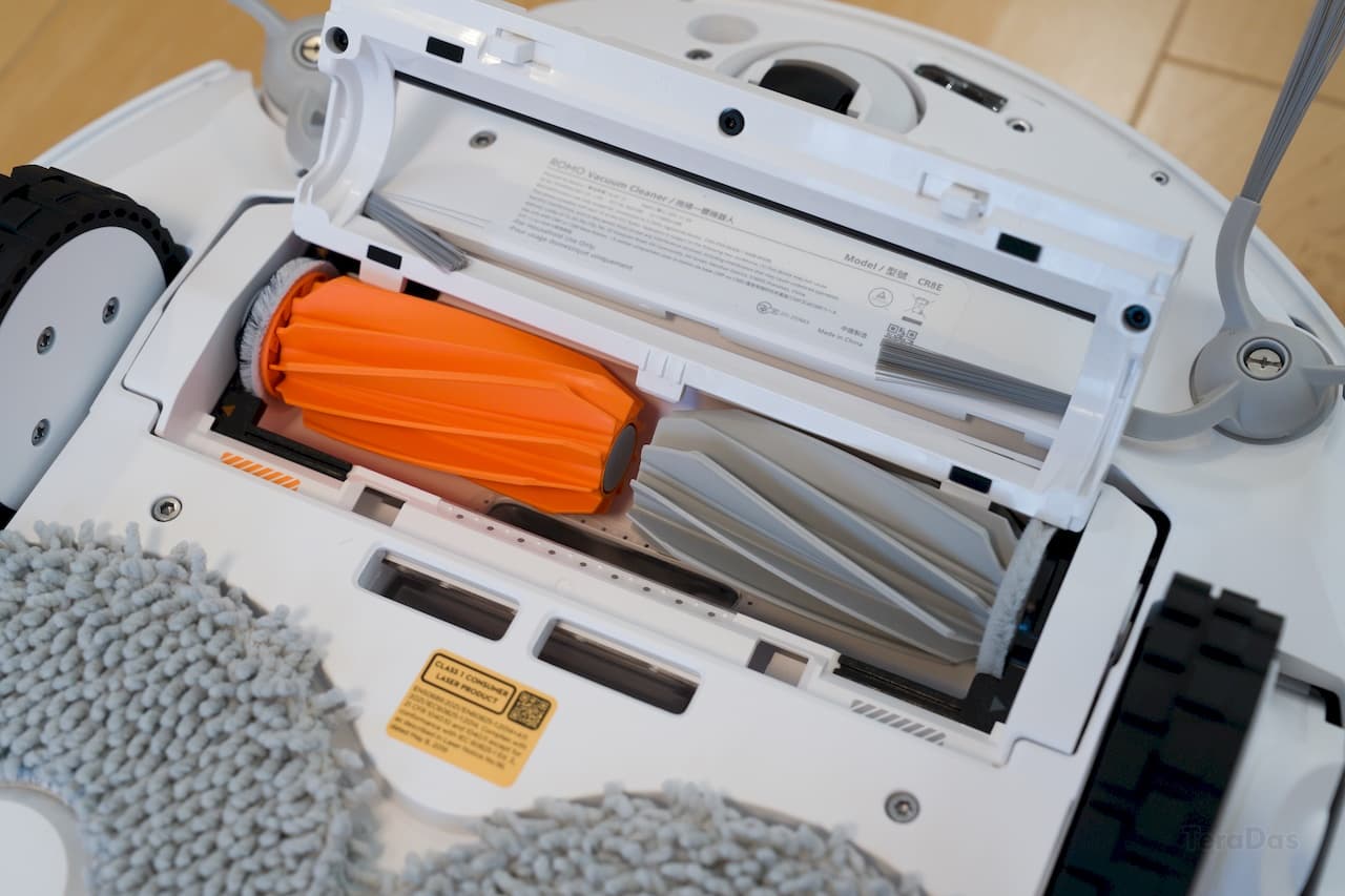 前方右側の回転ブラシもロボットアームで伸縮。モッピング範囲より広い範囲のゴミを事前に収集するからか、床へのゴミの張り付き残りがほとんど無い印象。かなり優秀です。