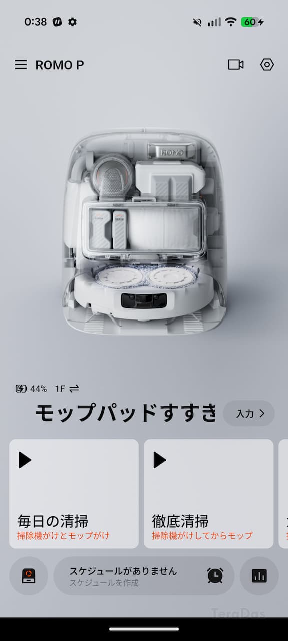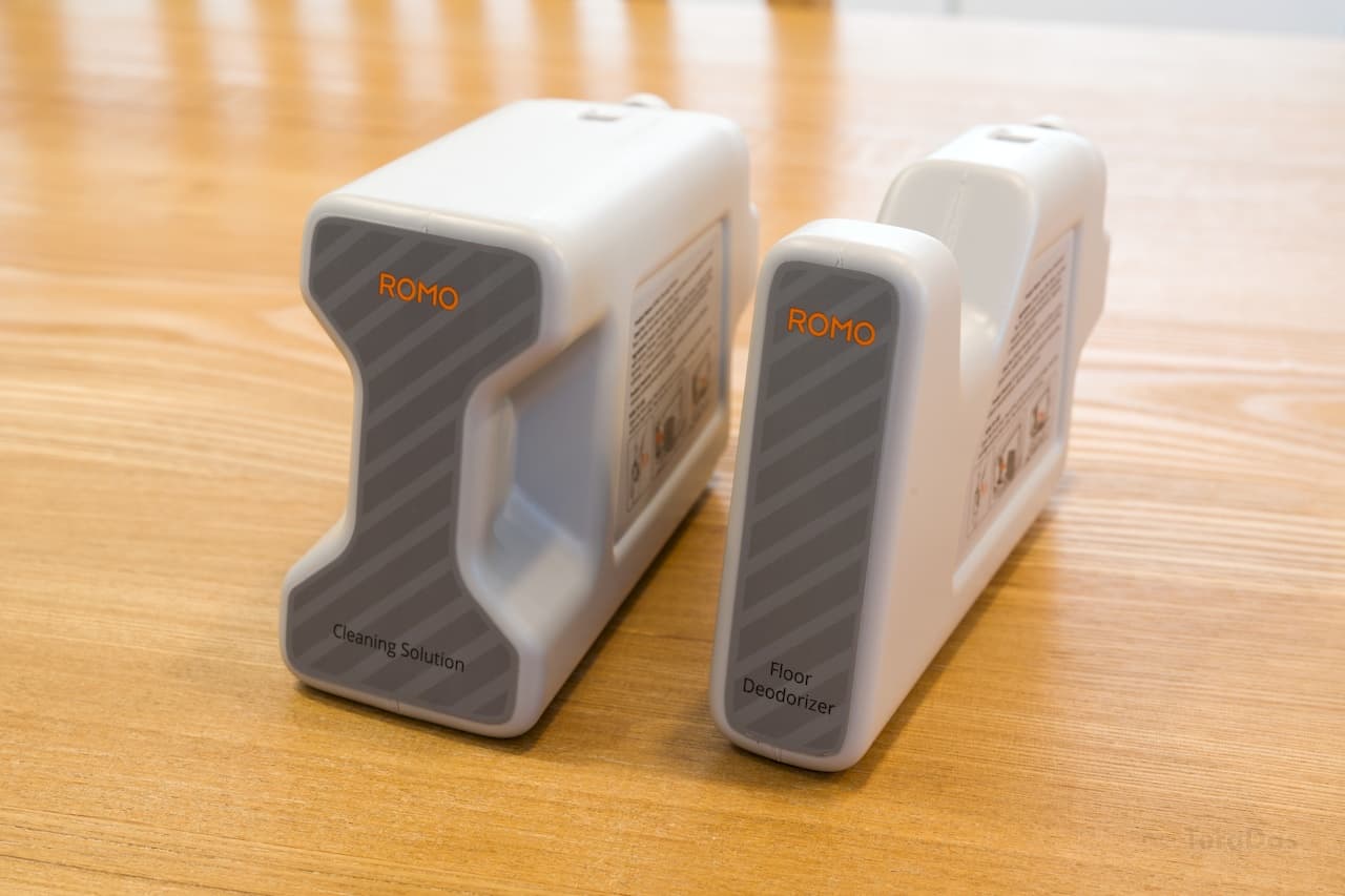 また、洗剤利用の他社との方針の違いも興味深いところ。「ROMO P」では、水拭き・洗剤拭き・消臭剤拭きの3つが選択でき、さらに洗剤・消臭剤でのモッピング後に再度水拭きも可能。