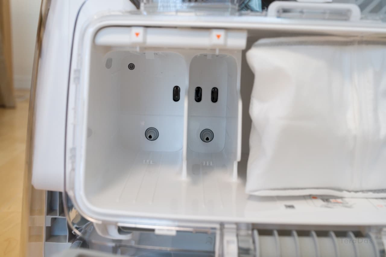 洗剤・消臭剤タンクの背面。下部穴からステーションへ供給。上のシール付き穴は製造時の充填用とみられます。