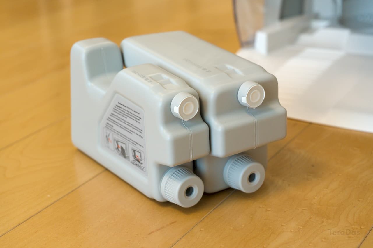水タンクは容量4リットル、汚水タンクは3.2リットル。使用水量はかなり多い印象で、1日1回面積 25㎡ の水拭きで、2~3日で空になる印象。