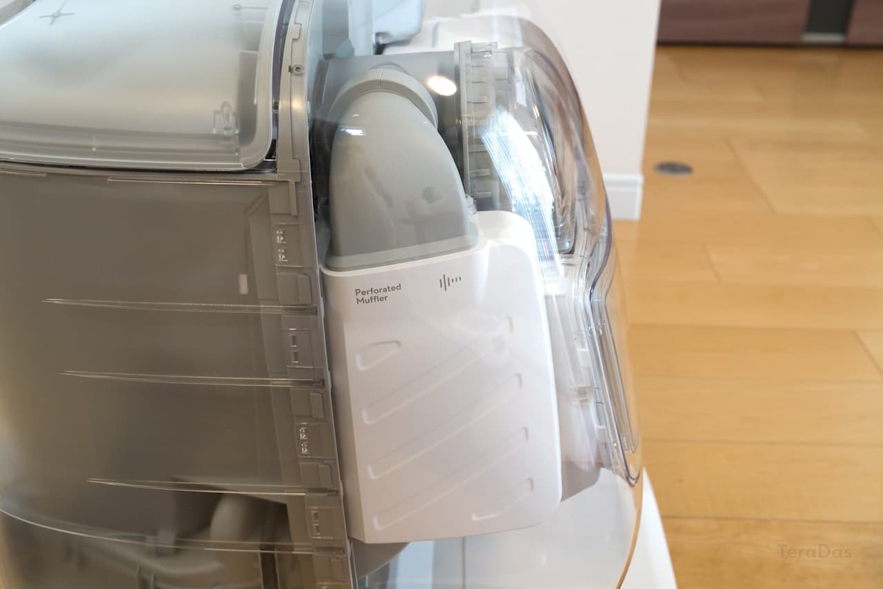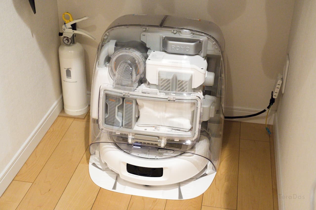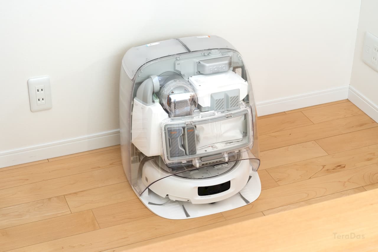 「ROMO P」はステーション・本体とも透明デザインが特徴。ビルドクオリティは高く、内部構造やエアフロー制御への自信が垣間見える、クリアパーツ多用デザインです。1ヶ月使っても目立つゴミの侵入はほとんどありませんでした。