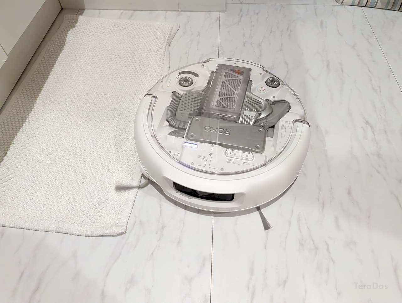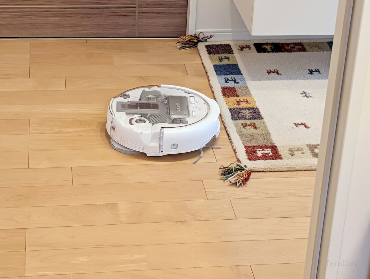 この手の「動いてしまう敷物」、特にマップ登録するとは限らない「着脱する敷物」は、今なおロボット掃除機の鬼門で、私の認識が確かなら、現時点で完全対応できる機種は無いか、少なくともほぼ無いのですが、「ROMO」には高い障害物検出能力と伸縮式回転ブラシというアドバンテージがあるため、そのような敷物の少なくとも一部には対応できるポテンシャルがあると感じます。