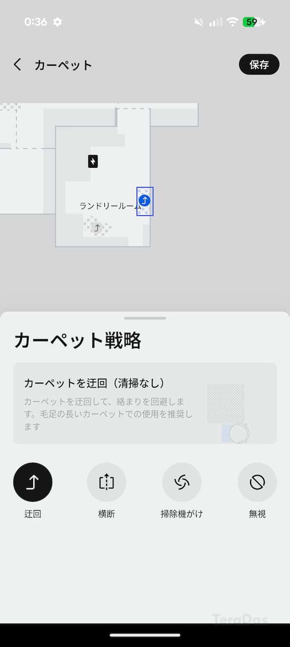 厚手のカーペットは「障害物回避設定」により障害物として回避させる運用もアリです。