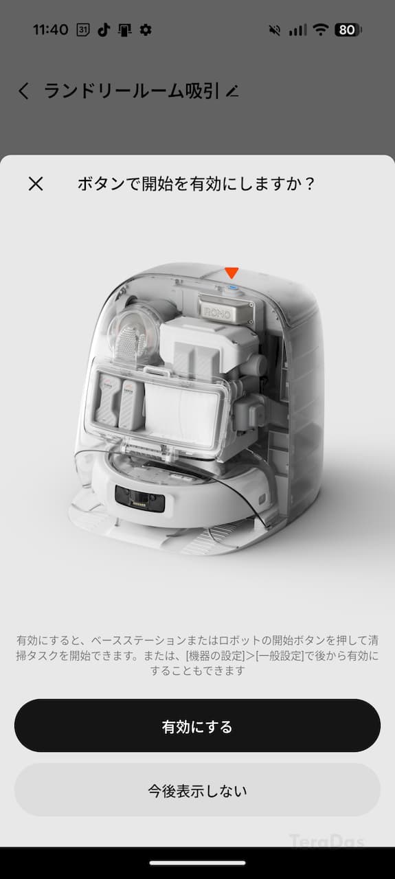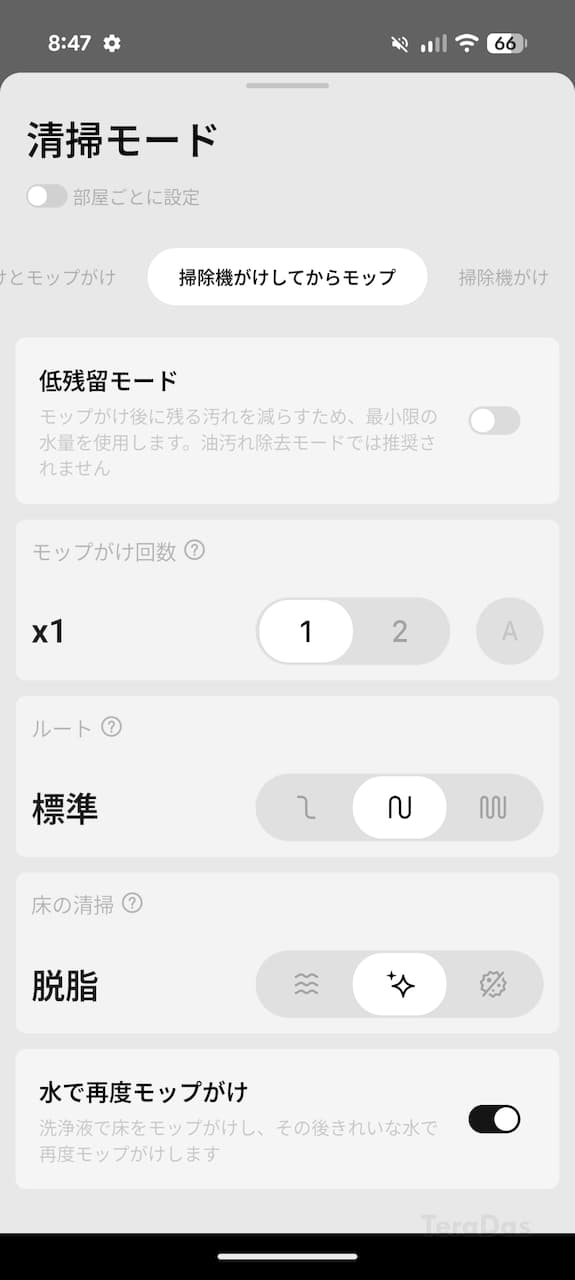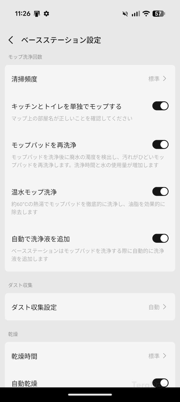 なお、今回のレビューでは、「モップパッドを再洗浄」「温水モップ洗浄」「自動で洗浄液を追加」「自動乾燥」「ダストボックスを自動で乾燥」はすべてONにしています。
