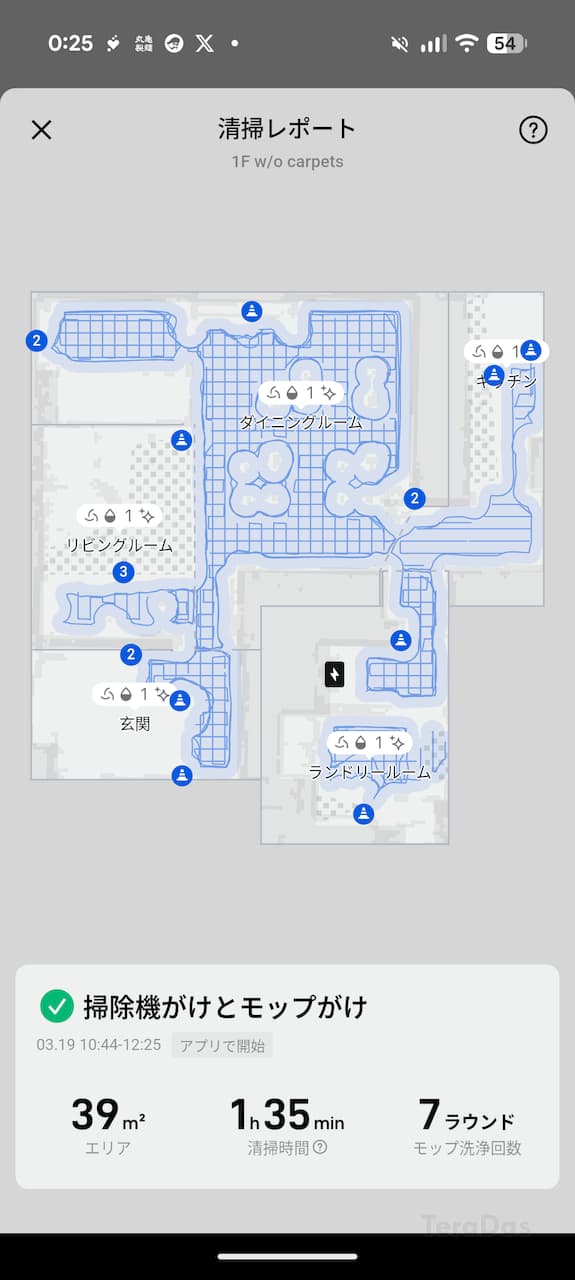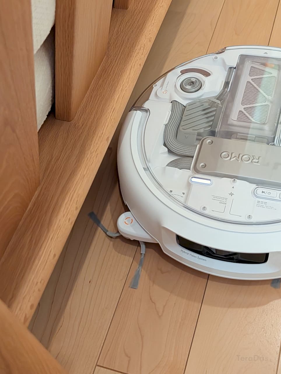 ここで「ROMO」は、右下の厚さ3mmの見切り材を認識し、極力またがないルートで清掃しつつ、左の敷物は回避。必要なら見切り材を通って右下エリアへ移動、というかなり知的な動作を見せてくれました。