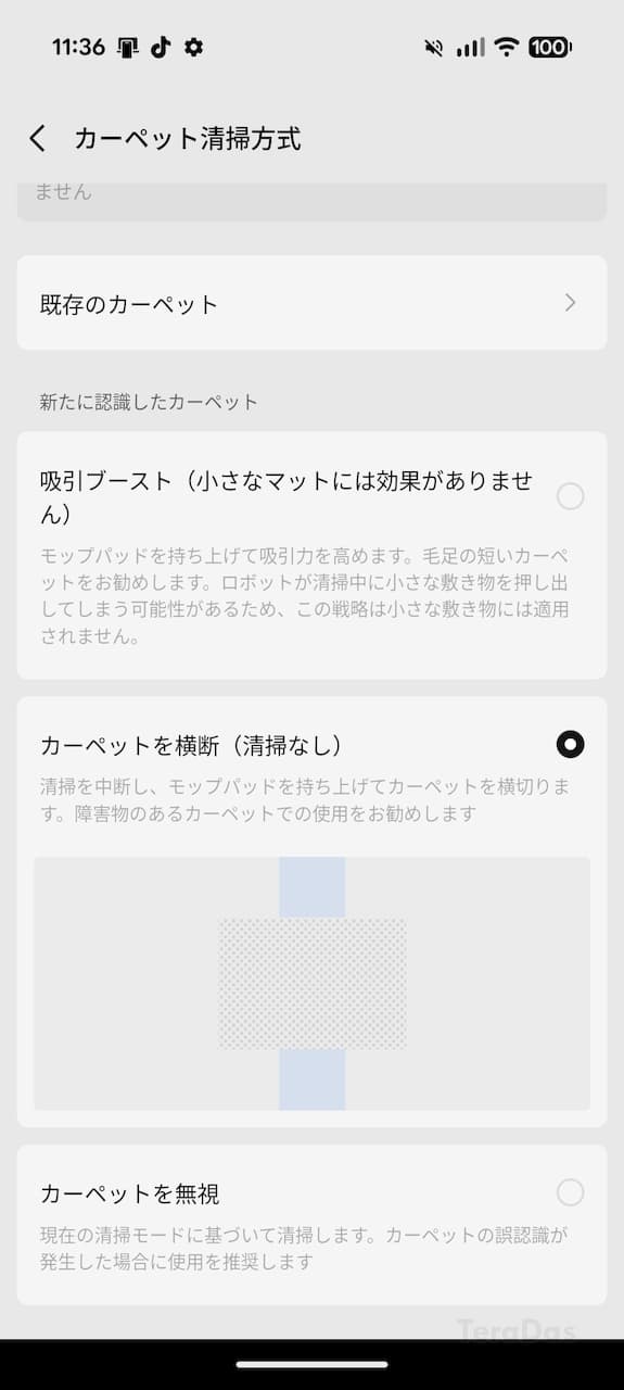 「ROMO」では、「既存のカーペット」と「新しく認識したカーペット」の清掃方法を別々に設定できます。