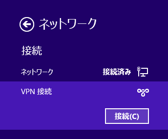 Winキー+I(またはチャーム→設定) → ネットワーク → VPN接続 →「接続」